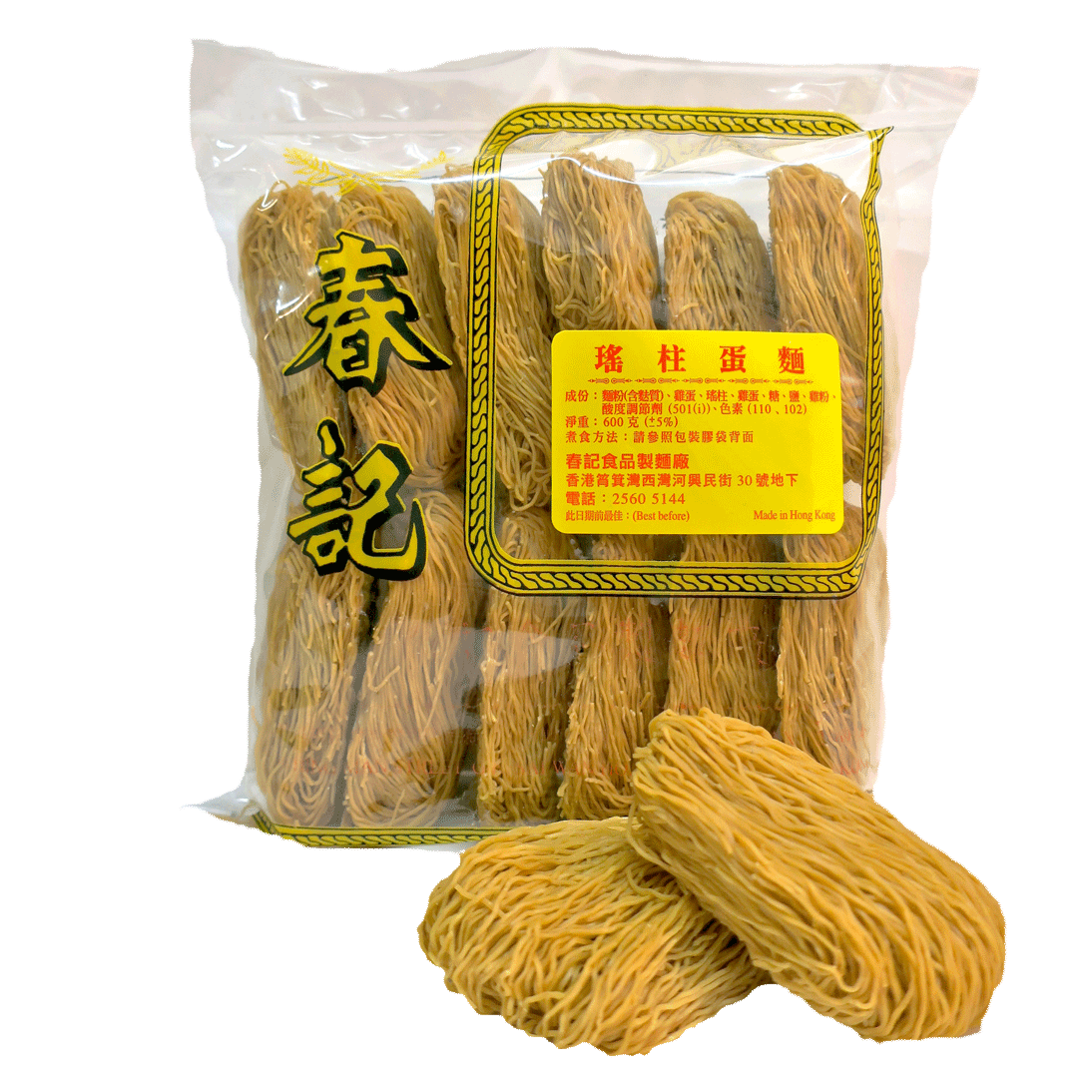 特級乾瑤柱熬製成上湯,配合新鮮雞蛋,高筋麵粉製成。麵質鮮味爽滑,適合湯麵和撈麵。